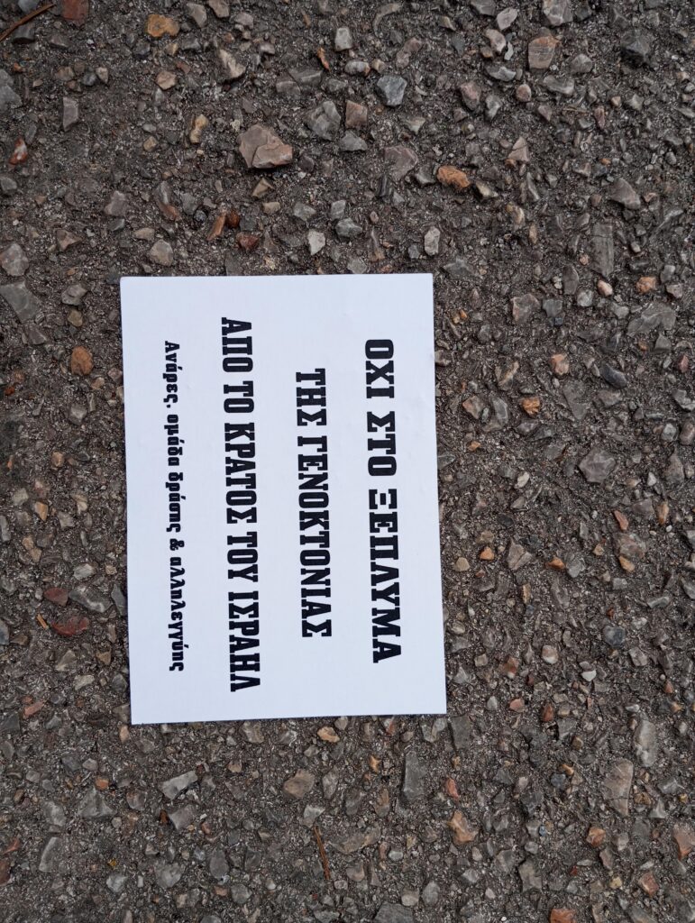 Σήμερα 10/5 επρόκειτο να πραγματοποιηθεί στη Διεθνή Έκθεση Βιβλίου Θεσσαλονίκης εκδήλωση την οποία διοργάνωνε η Πρεσβεία του Ισραήλ, λογοτεχνικού ενδιαφέροντος αλλά με σαφείς προεκτάσεις στο ξέπλυμα του κράτους του Ισραήλ για την γενοκτονία των Παλαιστινίων υπό το μανδύα του “πολιτισμού”. Έχουν περάσει μόλις λίγες ημέρες από την εξαγγελία του υπουργού οικονομικών του Ισραήλ, Μπεζαλέλ Σμότριχ που μιλάει ξεκάθαρα για εθνοκάθαρση, ενώ μία μέρα πριν υπήρξε έγκριση του συμβουλίου ασφαλείας του Ισραήλ για περαιτέρω βομβαρδισμούς και σφαγές στη Γάζα με σκοπό την κατοχή της.