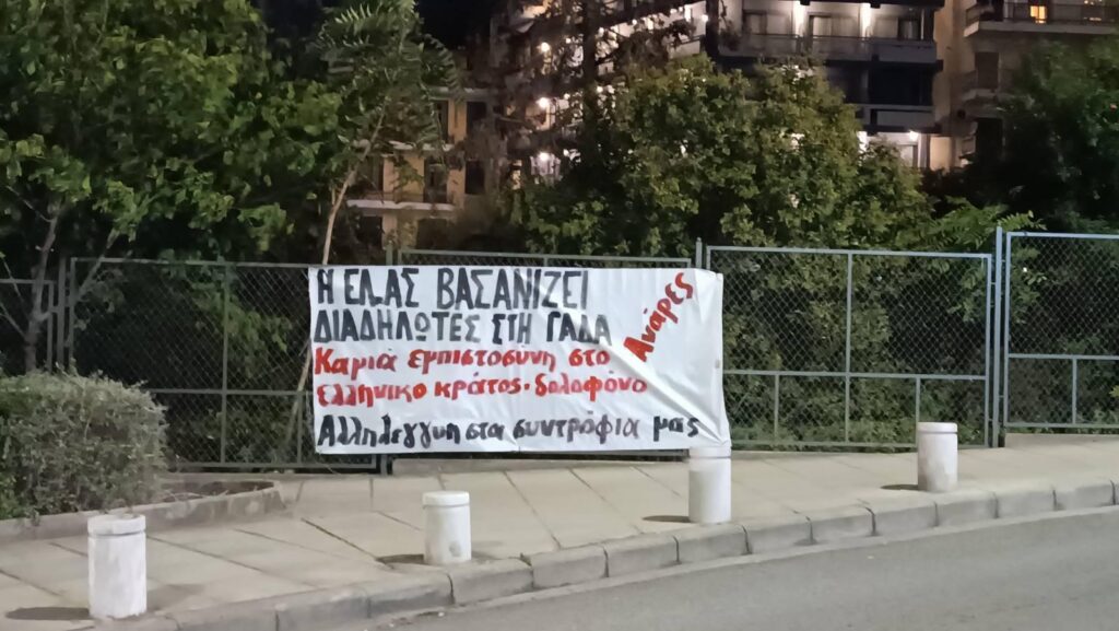 Στην πορεία αλληλεγγύης στον Παλαιστινιακό λαό και την Παλαιστινιακή Αντίσταση της 7ης Οκτωβρίου στην Αθήνα, ξέσπασαν συγκρούσεις των διαδηλωτ(ρι)ών με τις δυνάμεις καταστολής. Τα μπλοκ του α/α χώρου που δέχτηκαν κυρίως την επίθεση του μηχανισμού καταστολής, στάθηκαν με αξιοπρέπεια στο δρόμο. Συνελήφθησαν 25 συντρόφια, εκ των οποίων στα 18 ασκήθηκαν κακουργηματικές διώξεις, ενώ βάσει του (νέου) ποινικού κώδικα κρατούνται ακόμη στη ΓΑΔΑ, ενώ θα οεράσουν από ανακριτή την Παρασκευή 10/10 . Κατά τις συλλήψεις πολλά συντρόφια δέχτηκαν ξυλοδαρμούς από τα θρασύδειλα καθάρματα της ΕΛ.ΑΣ. Ένας Παλαιστίνιος διαδηλωτής συνελήφθη και δέχτηκε ξυλοδαρμό – βασανισμό μετά τη μεταφορά του στη ΓΑΔΑ, με αποτέλεσμα να του σπάσουν το πόδι.