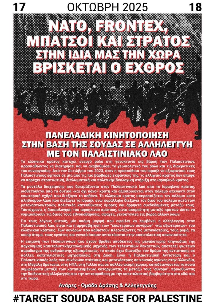 Κάλεσμα σε Πανελλαδική Κινητοποίηση στη Βάση της Σούδας αλληλεγγύης στον Παλαιστινιακό λαό, Μουζουράς, Χανιά, Σάββατο 18/10,13:00